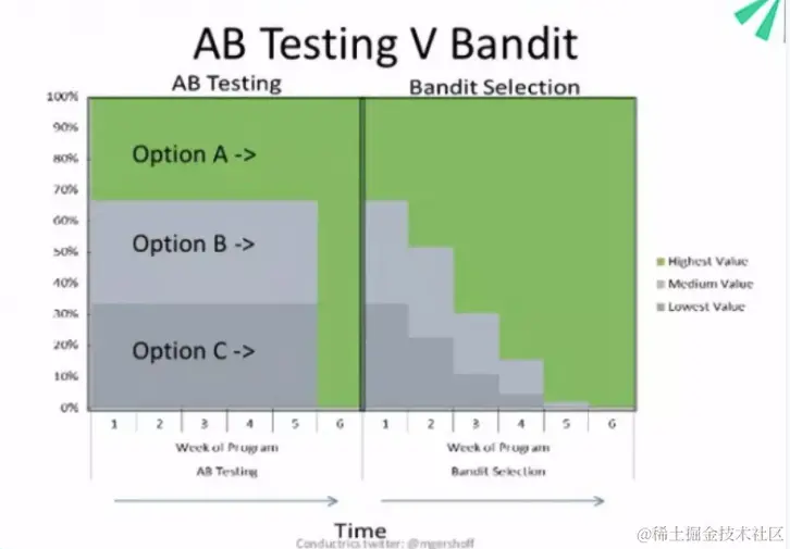 Bandit算法潜在缺点:1)相较于传统ab测试,Bandit算法需要更多的人力成本和工程开发;2)bandit算法无法很好的处理最佳选项判定的时间成本和收获最佳效果的时效性需求间的矛盾;3)Bandit算法可以动态的在短期内找到最优选项,但对于那些需要长期才能体现的策略 或者 需要观测长期效果的策略,Bandit并不适用。