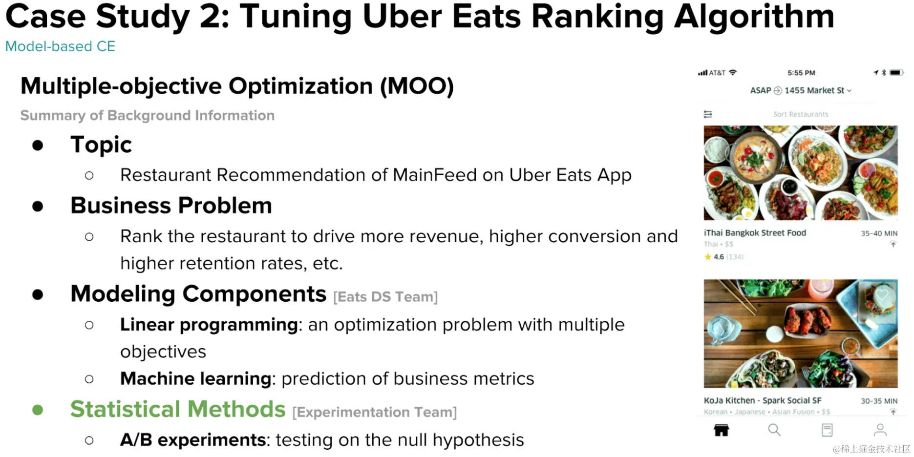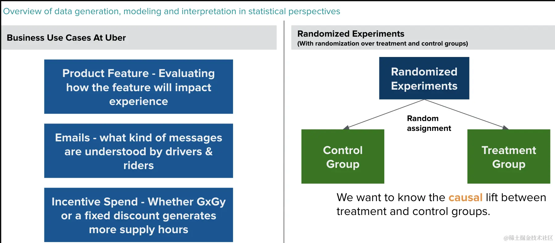 Uber实验的典型场景包括:司机端以及用户端的功能层面上的改动;邮件营销,何种信息内容可以更容易被用户和司机理解;司机奖励是否可以鼓励司机服务更长时间;匹配策略以及定价类实验(分流单位会变成时空片)等。