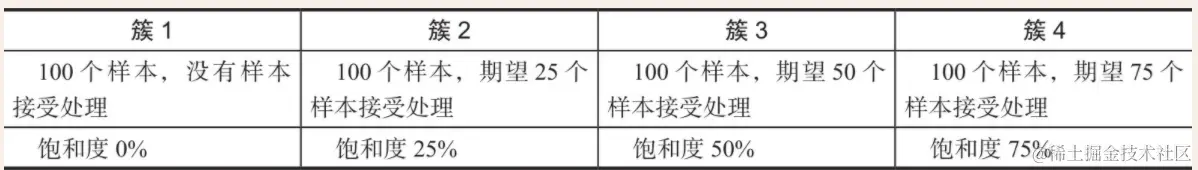随机饱和度实验,也叫做两阶段随机化实验。顾名思义,该实验设计方式在设计过程中分别进行了两次随机,其中饱和度可以理解为在簇(cluster)中接受实验策略的比例。