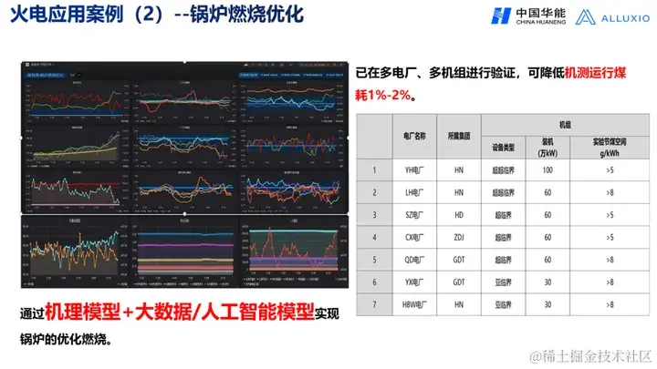 锅炉掺烧比较复杂,因为锅炉本身是一个特别混沌的体系,它受比如煤成分等很多因素影响。所以锅炉掺烧很多的能源企业都在研究包括华能。后来我们发现锅炉的燃烧效率跟人的操作有很大关系,比如在电厂里面经验特别丰富的老师傅他们操作这个炉子能控制得特别好,因为他们知道什么时候风门加多少,什么时候水加多少,什么时候把烟气调到什么程度。所以后来我们就用AI模拟的方式把人的一些经验以及大数据结合在一起去做锅炉调节,把各个参数主要是挡板的开度和风之间根据火焰燃烧的中心位置做上下调动,上下调动完整个锅炉的热值效率是绝对不一样的。这个应用能够给整个电厂提高效率,比如有的电厂能降5克,有的电厂能降8克,收益非常大,因为我们一年要燃烧掉将近好几千吨、上万吨的煤,所以每一克的煤其实能给我们省出来特别大的利益。