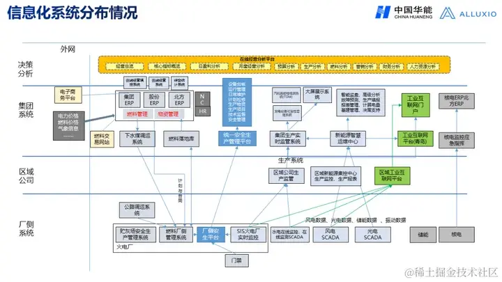 华能整个信息化系统建设如上图可以看到一个很大的趋势:从横向来说,我们各个业务系统都是独立的:像以中间偏左侧这块,以ERP为主,人资、财务、物资、燃料。这一块是指现代集团侧,集团有这些数据,相当于这些板块也是比较独立的。