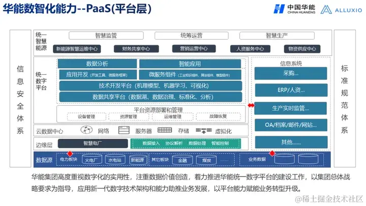 统一技术平台包括数据平台、技术开发平台,上面其实主要支撑两条线:BI、AI,再上面支持我们各种业务板块:营销、财务、生产、融资、供应链等,这就是华能整个PaaS大概的架构。