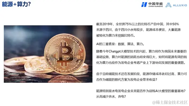 掣肘于华能发展大模型的很大一方面就是算力。但其实我们也在考虑能源和算力之间到底是什么样的关系,全世界75%的比特币都是从四川小水电挖出来的,相当于他们用四川廉价的水电去挖了比特币,其实就说明我们的大量能源被转化算力其实是很成功的,能源和算力是有一个天然的关系,为什么说储能技术还处于发展阶段?是因为储能的成本太高,比如建的很多大型能源中心存储两个小时的储能,大概造价要14个亿。为什么这些能源它不能转化为算力呢?