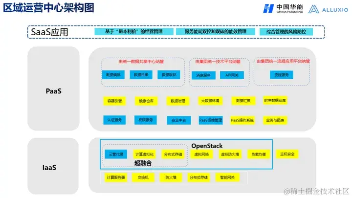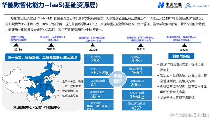 上图是华能的整个IaaS层,因为华能的数据中心建的比较早,2018年的时候已经完成整个青岛主要的master阶段数据中心的建设。每期我们也在做扩容,现在也建成了包括master在青岛的一个大的数据中心,以及在二级各个省分布了14个小的二级云接点。而且这些云接点建成了一朵云的体系,它与整个集团的主流数据中心形成一个公有云的网络。