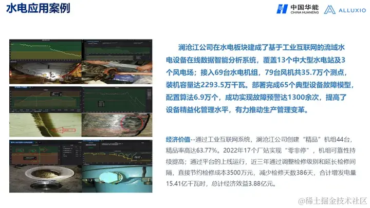 传统水电检修一年反正不管机组坏没坏会把机器停机把所有部件都拆开来看一遍。但是通过机体学习的AI模型,我们发现设备的运行趋势是可以通过大数据判断的,随着这个趋势会慢慢往往下降。所以后来我们建立整个工业互联网AI体系之后就不再做那种定期的检修模式了。有些机组除非当裂化趋势裂化到一定程度以后我们才去做检修,其余的时间正常运行,因为能够正常运行不停机带来的收益就是持续的可观的收益。在澜沧江我们有大概44台机组都在利用这种检修体系,帮我们直接节省了检修成本大概3500万元,如果还要计算整个减少的检修天数,整个澜沧江公司三年来为华能带来大概三点多个亿的利润。