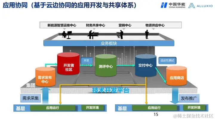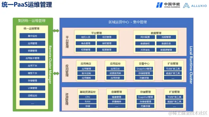 技术开发平台是我们在区域之间区域侧部署的底座,我们不要求区域有一个特别强的开发能力,不需要有非常多的开发工具,完全集中在集团上面开发,使用Alluxio调取上来数据后通过现有的开发工具,再用容器镜像分发下去,达到一种云边协同的方式。使得开发的所有业务集团都可感知,并能共享,方便进行大批量推广。