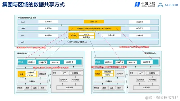 数据目录通过API的方式调度只能调用小批量的数据或者指标类经过深度数据治理以后的数据,如果一旦数据量过大比如说一个P两个G的这种明细数据的话,通过API调用无法实现,所以我们使用Alluxio构建了集团与区域之间数据流通的高速通道。