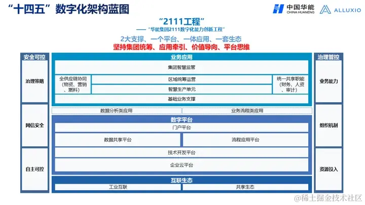 其中最核心的一个“1”就是我们的数字平台,华能有一个统一数字平台,包括底层企业云平台是华能比较大的数据中心,上面架了一个统一技术平台,是整个集团内部统一的技术框架,再往上是数据共享平台、流程应用平台以及门户。这一套统一数字平台支撑了整个华能集团一体的应用,这个应用可能分各种业务板块,它下面其实我们要发展的是一套互联生态,包括工业互联以及我们的共享生态。