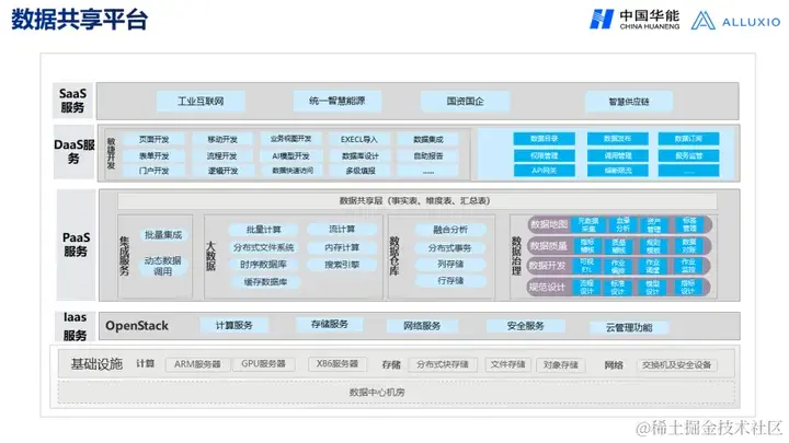 PaaS层是指包括数据集成、传统的ETF、实时数据库。中间这块是大数据的环境,包括像Alluxio的数据编排,主要是跟我们大数据环境,大数据HDFS体系集成在一起的,包括数仓,我们的数据治理,以及往上就是我们DaaS的服务。