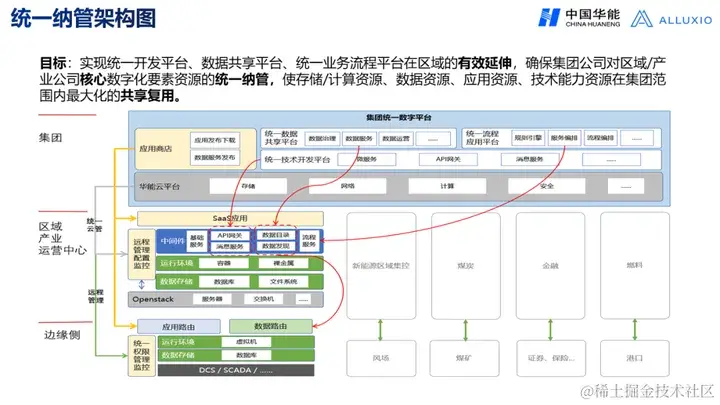 华能58家二级单位、480家的三级单位应该怎么建?基于这些问题和现状,在2021年的时候我们跟Alluxio进行合作,共同写了整个华能统一纳管的架构方案。这个方案我认为是现在我们在央企里边比较核心的一套体系,能让全集团所有我们认为重要的数字化资源能够真正的统一集中,它的统一集中并不是要掌管它、监控它,而是让存储、计算、数据、应用、技术能力,能够在全集团范围内最大化流动起来,让大家最大化使用这些资源,这才是我们的最终目标。