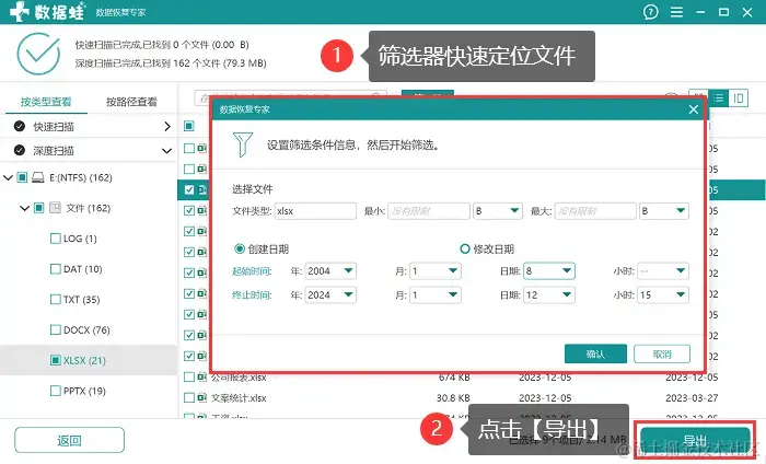 步骤4:深度扫描会花费较长时间,深度扫描结束之后,用户可先对文件进行查看和勾选,如果文件呈现较多,建议在【筛选器】 中限定文件条件,以便更快速定位文件,定位到之后,将其勾选上,点击 【导出】 。