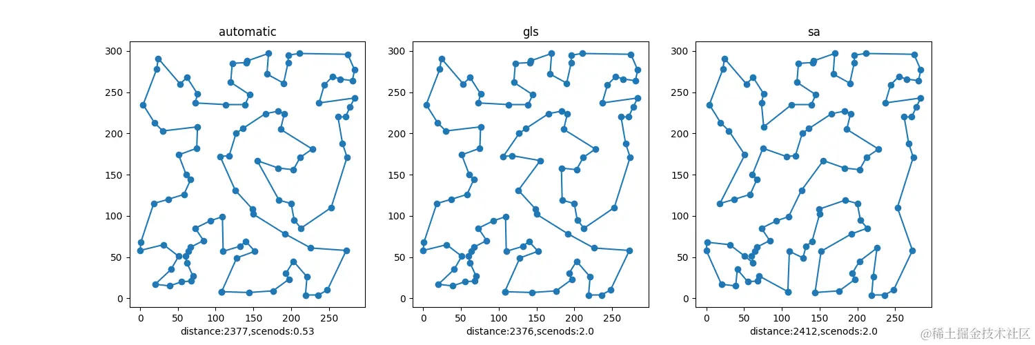 使用随机点位测试:自动模式、GLS(基于遗传算法的优化算法)、拟退火算法,并使用matplotlib可视化输出。