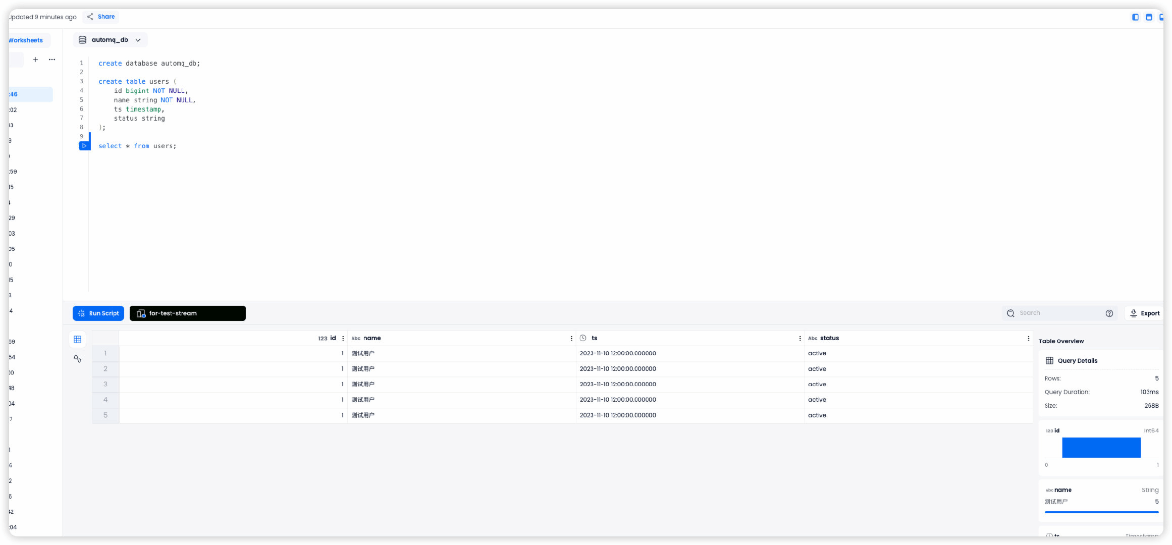 到 Databend Cloud worksheet 中查询 automq_db.users 表,可以看到数据已经从 AutoMq 同步到 Databend Table。