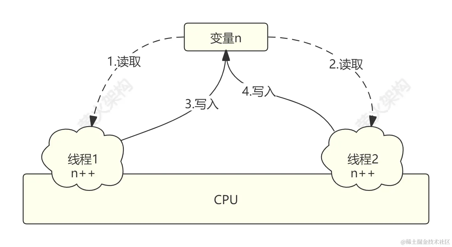 所谓并发控制,说的是同一程序进程内不同线程间访问相同资源时的冲突处理,有时候也称为进程内同步。比如一个简单的内存累加计数操作,如果不进行同步,不同的线程可能就会获取到同样的数值,累加出相同的结果,最终结果也就不准确了。如下图所示,线程1和线程2按照图中的顺序操作变量n就会出现同步问题。进程内同步就是用来解决这种问题的。