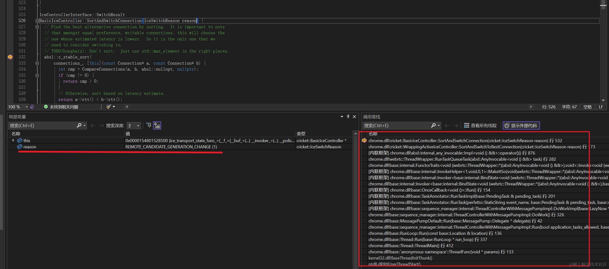 - 刚才是看代码从后向前推导,使用debug方式的话,可以直接打到最开始的位置,这里看到reason是REMOTE_CANDIDATE_GENERATION_CHANGE,如果想这条链路可在调用栈上继续向前追踪