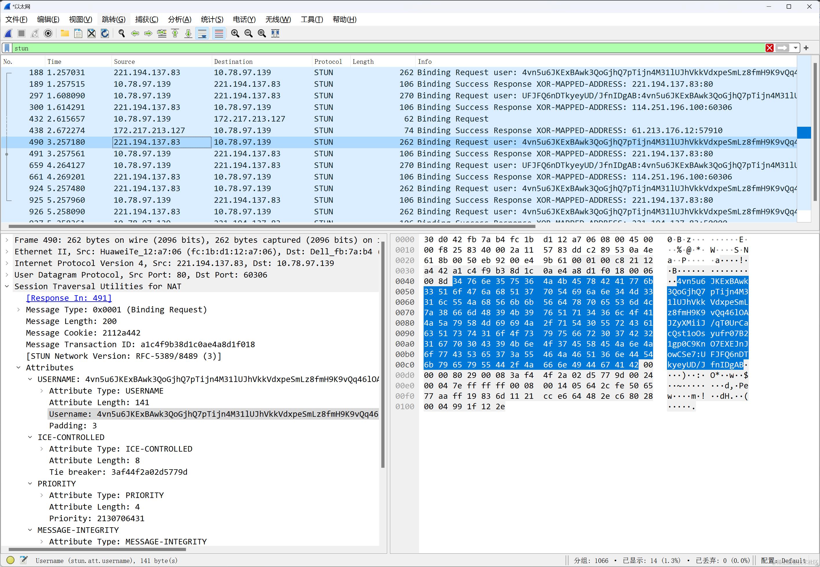 Message Length:消息长度必须包含不包括20字节STUN头的消息的大小(以字节为单位)。由于所有增加的属性都填充为4字节的倍数,因此该字段的最后2位始终为零。这提供了另一种区分STUN数据包和其他协议数据包的方法。
