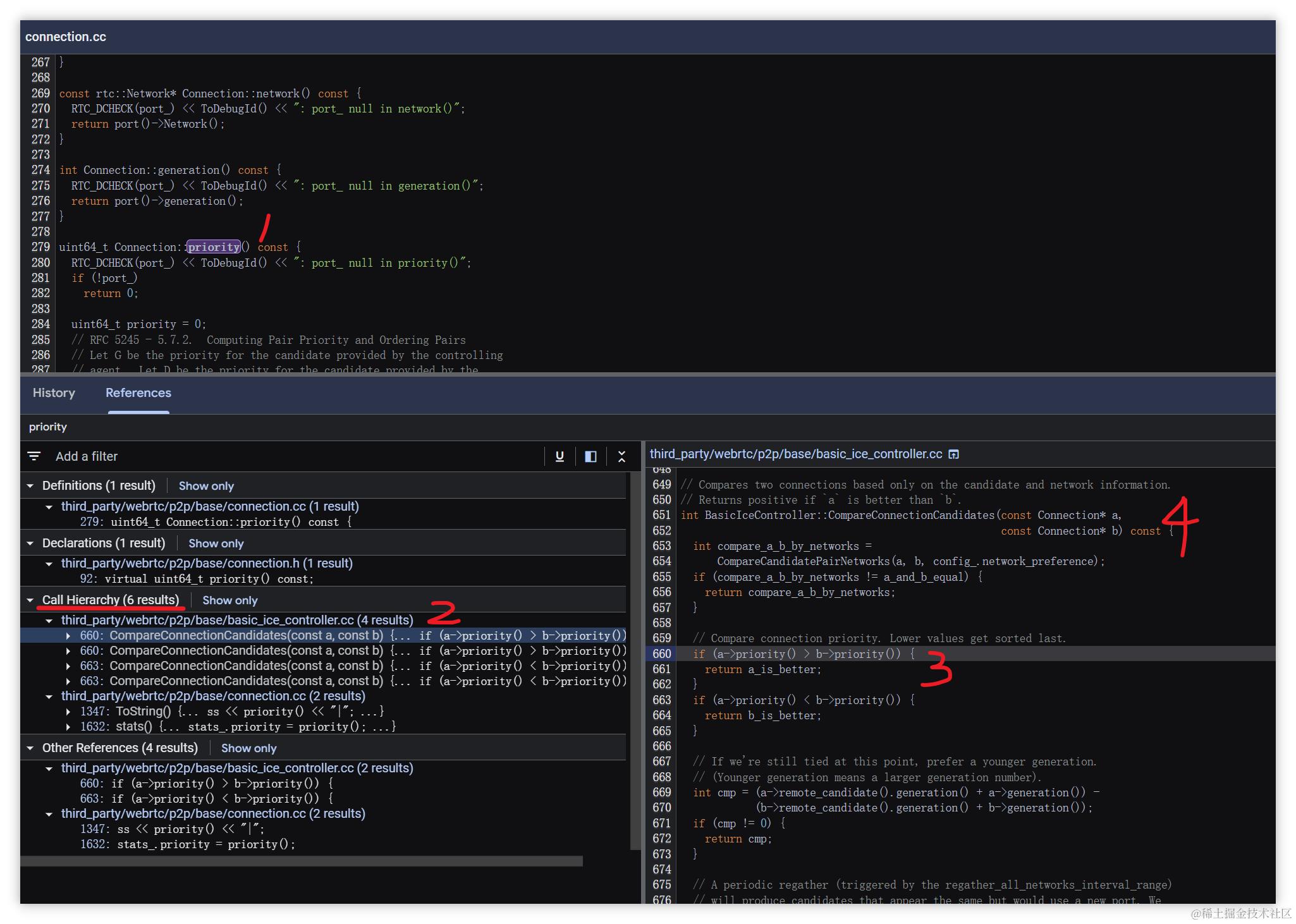 - 在source.chromium.org上点击 Connection::priority在下方可以看到调用的地方,点击其中一个在右下角显示具体代码,可以看到是在CompareConnectionCandiates里补充调用的,后面追踪的方式相同,不再单独截图了