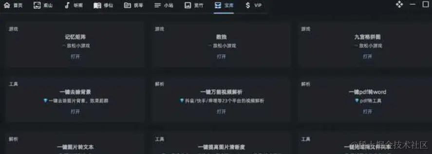 宝库包含了各种工具和小游戏,例如记忆力游戏、九宫格、数独游戏;又例如视频地址解析、pdf转word、局域网文件共享;又例如ai律师、ai求佛等。不过部分功能只支持VIP用户。