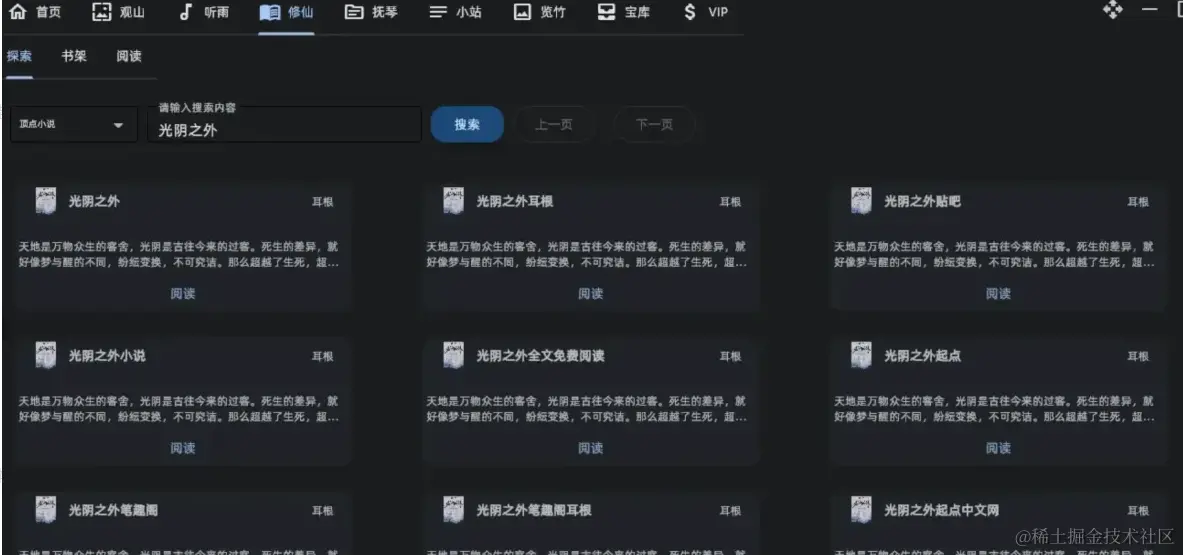 修仙提供了小说阅读功能,左上角可以切换小说源,可以搜索观看网络小说,可以搜索观看近现代小说,甚至古代小说,并且网络小说的更新还比较及时。