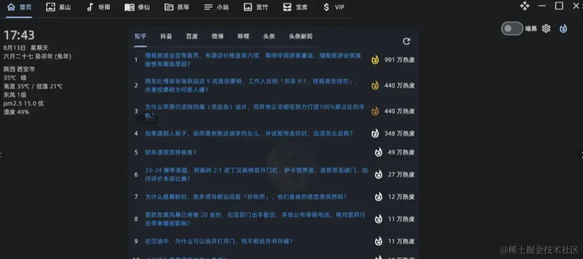 首页左上角显示日期和天气,中间部分有热搜排行,右上角可以切换主题,打开右上角的全局设置,可以进行基本页面设置和保存设置。