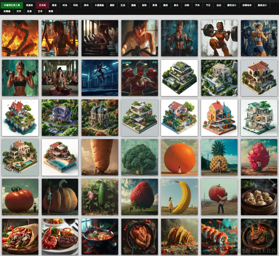 词图库是一个创意平台,专注于分享AI绘画关键词和AI生成图像的资源和灵感。涵盖30+种类,100000+关键词(还在持续增加中),如真实感,艺术风格,照明,氛围,中国文化,人物表情,人物姿态,童话场景,生活场景,交通工具,建筑,人物面部特点等等。