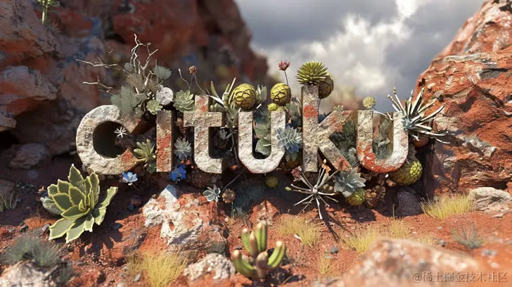 用岩石和植物拼出cituku这个词,风格融合了Theo Prins、简化的形式、后期处理、Doug Aitken、乡村静物、复杂的层次和纹理、Patrick McHale等元素。