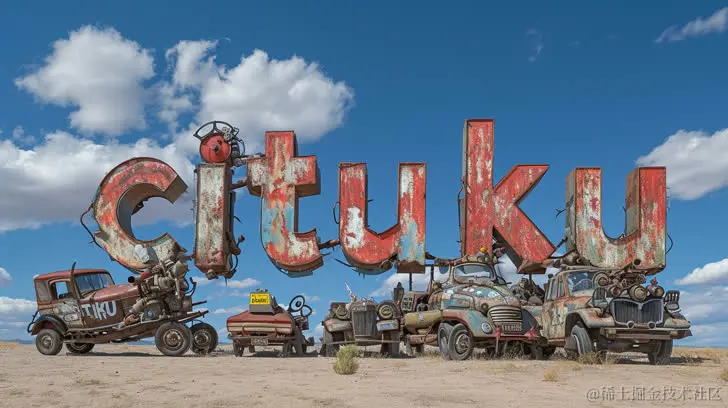 以一些不同类型的车辆拼出单词cituku,风格融合超现实机器人、数字手动、Herb Ritts摄影风格、工程/建筑设计、Mandy Disher、Frostpunk、Bruno Catalano等元素。