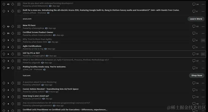 敏捷在很长一段时间里一直专注于错误的事情,reddit的敏捷版块就是个很好的例子。看看过去一周(2023年8月中旬)的热门职位(我敢肯定,如果你现在去看也还是一样),很多帖子都在讨论该拿哪个证书、讨论"UAT应该通过PO还是BA来完成?"、如何处理表现不佳的开发者、讨论"信任比敏捷更重要",以及我最喜欢的关于框架、方法论的区别的讨论,最后是"你能坚持做敏捷多久?"