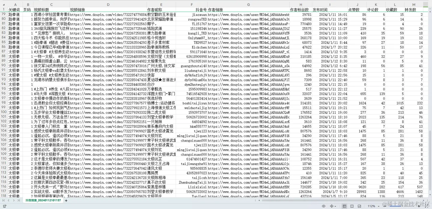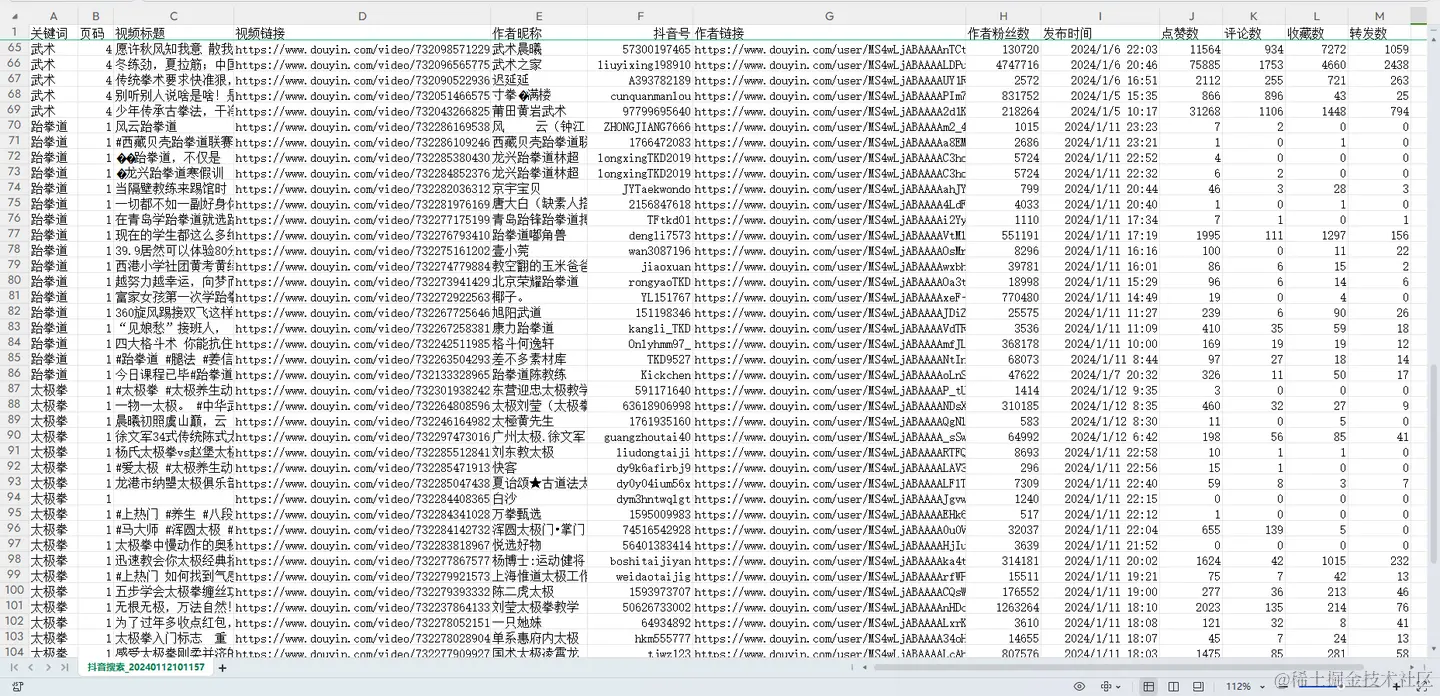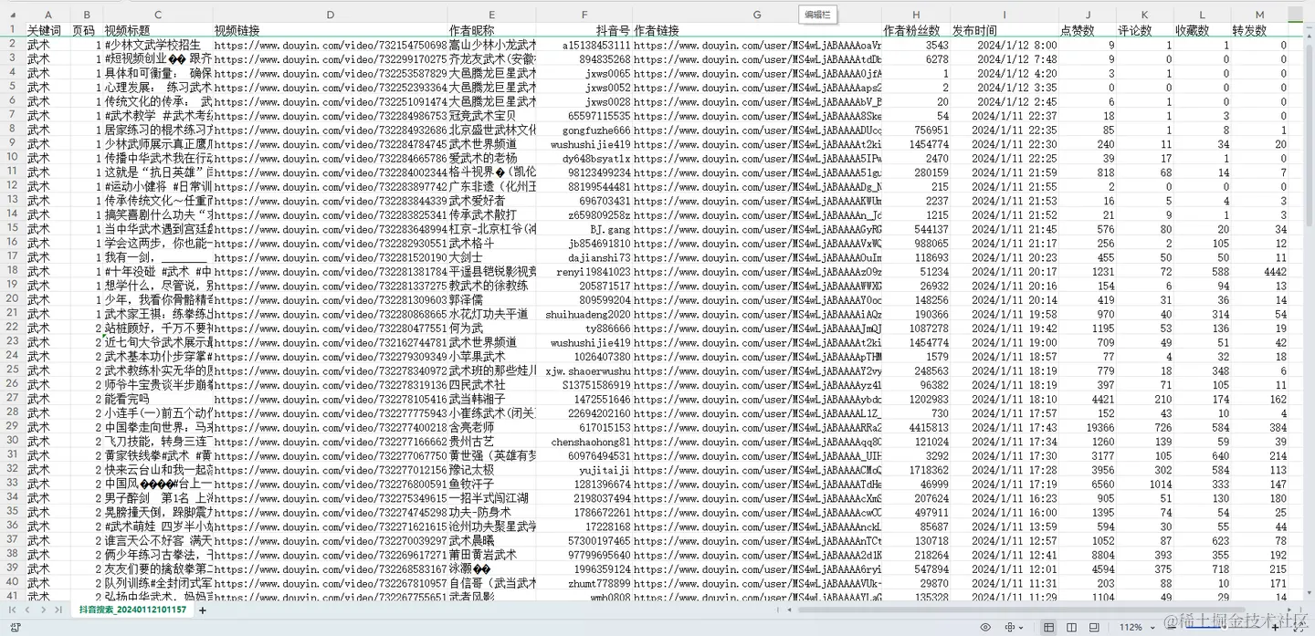 - 可爬13个字段,含:关键词,页码,视频标题,视频链接,作者昵称,抖音号,作者链接,作者粉丝数,发布时间,点赞数,评论数,收藏数,转发数。