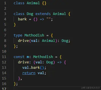 const func:(val:Animal)=>Dog = (val:Dog)=>{