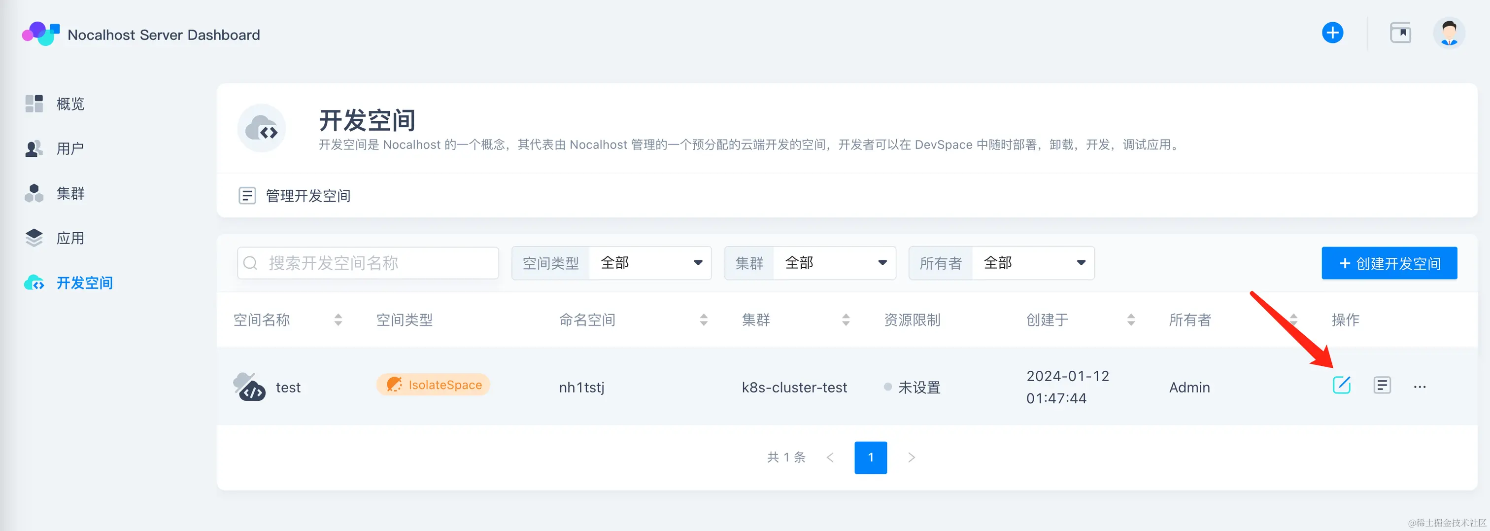 回到开发空间,选择之前创建的 test 空间,点击画笔图标: