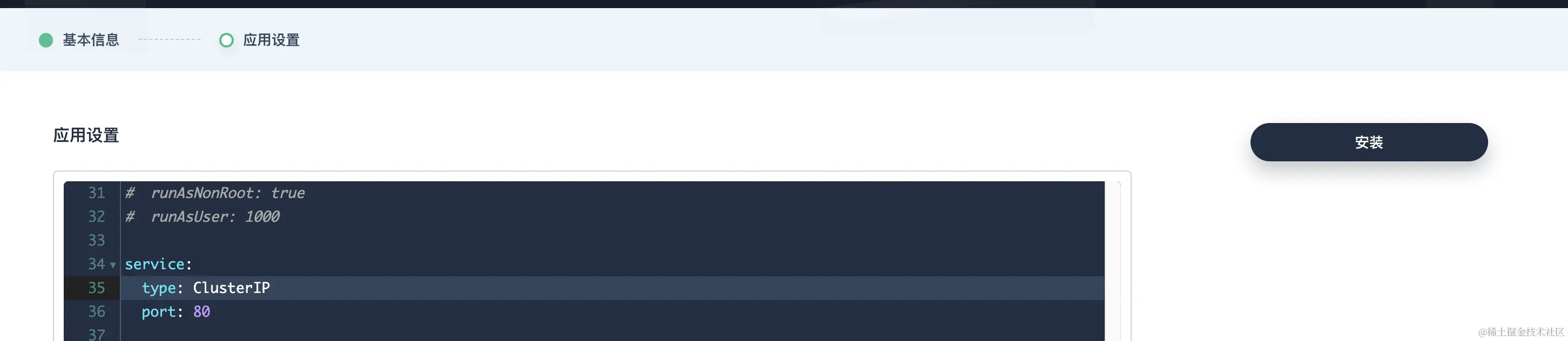 在「应用设置」标签页,可手动编辑清单文件或直接点击「安装」。建议把 service.type 设置为 ClusterIP,以确保安装不受 Kubernetes 网络环境影响。