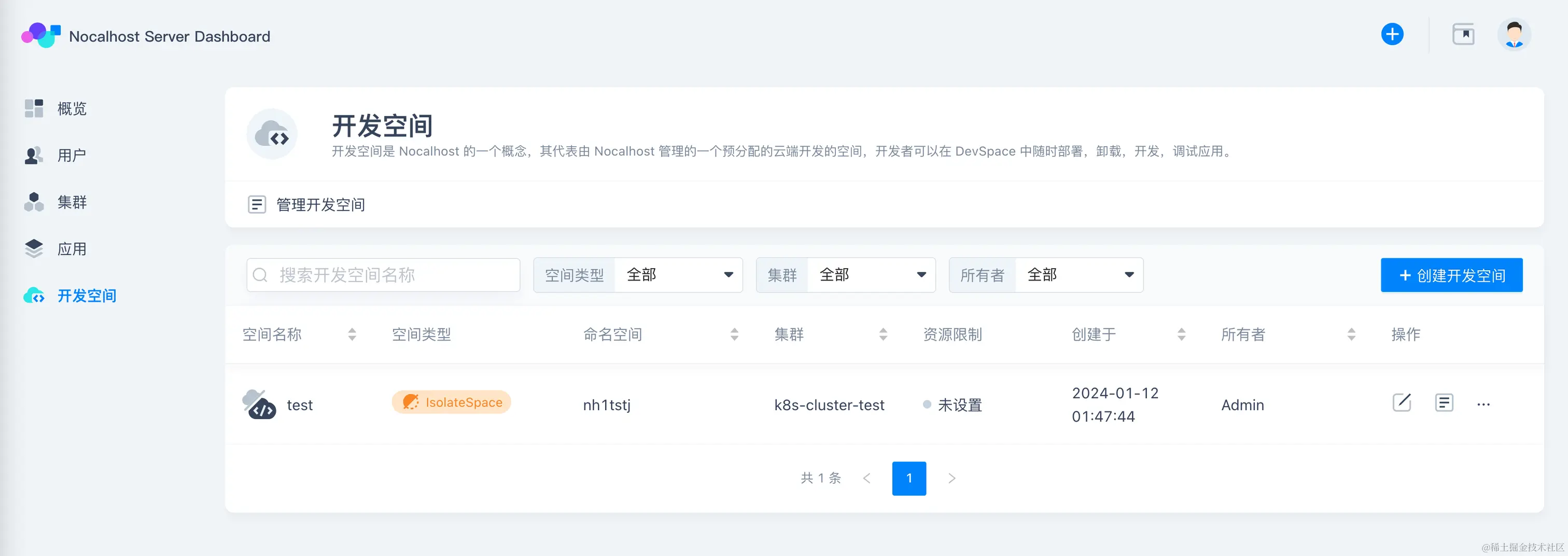 创建完成后,在「开发空间」页面看到已创建的隔离开发空间: