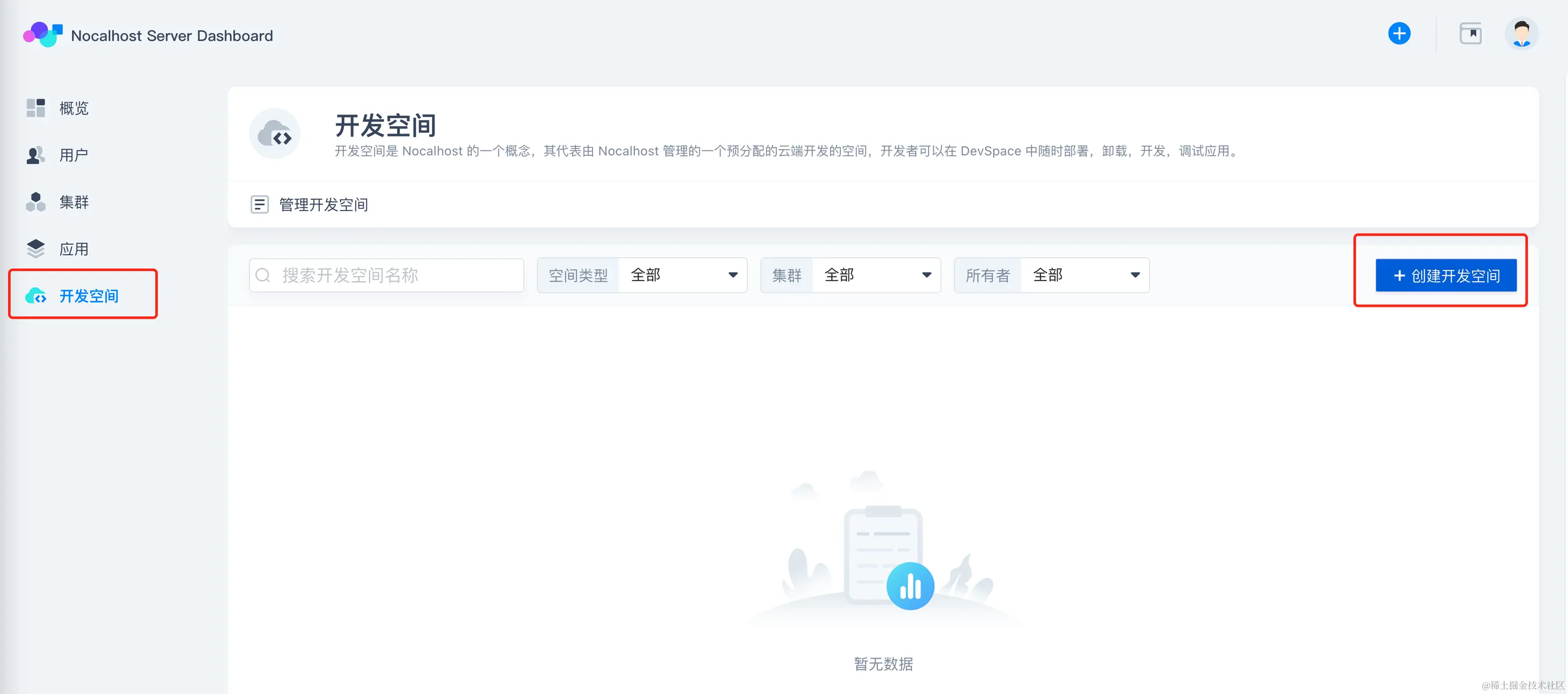 「开发空间」选择「创建开发空间」: