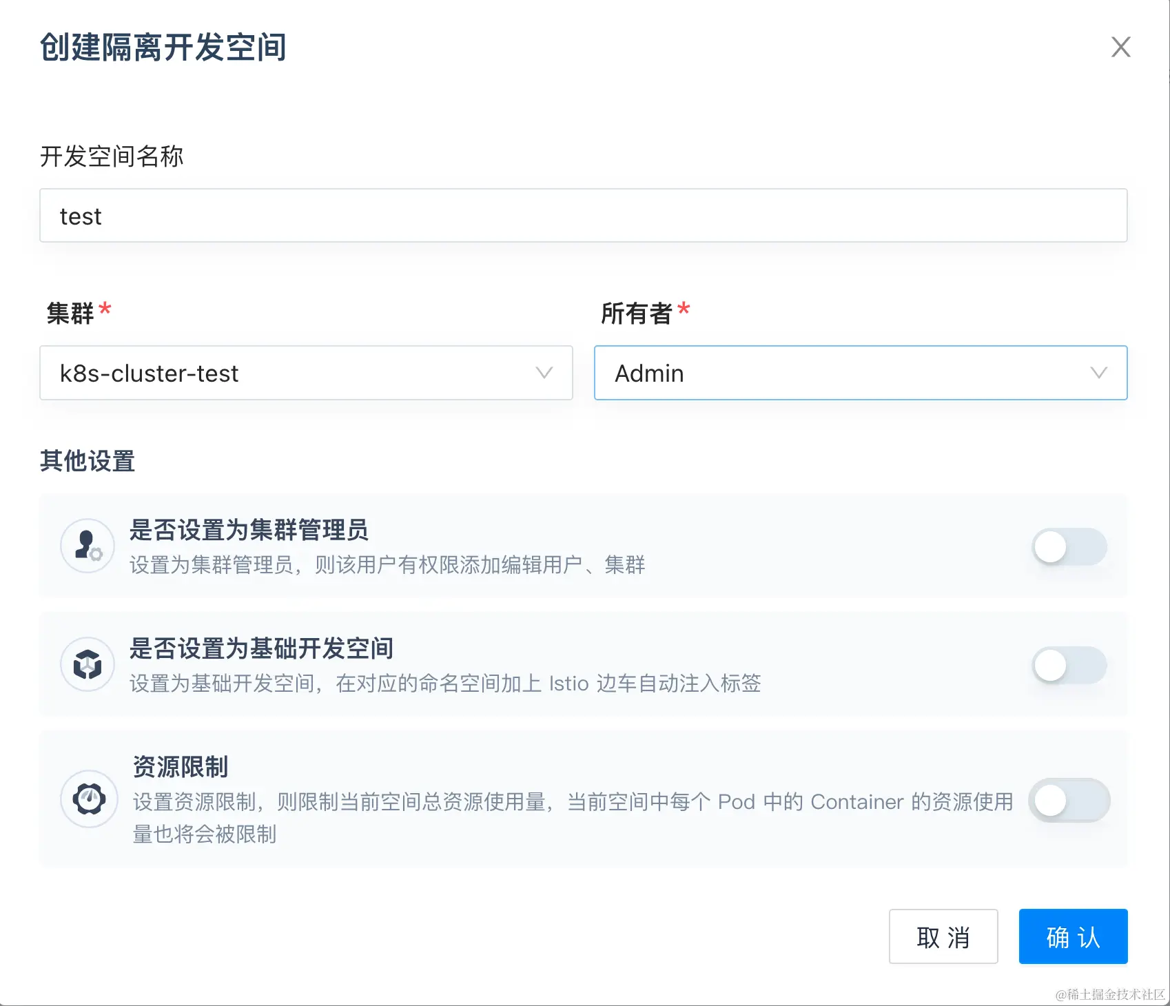 填写「开发空间名称」(这里置 test),选择「集群」和其「所有者」,并按需进行「其它设置」: