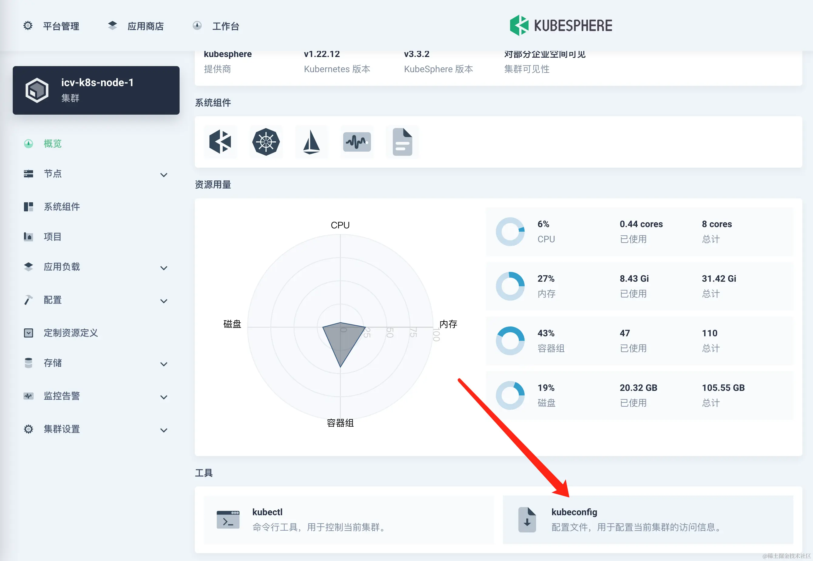 可在 KubeSphere 集群页面,获取当前集群的 kubeconfig 文件。若使用 kubeconfig 文件的应用部署在当前集群外,需将 clusters:cluster:server 参数值改为对外暴露的 KubernetesAPI 服务器地址。