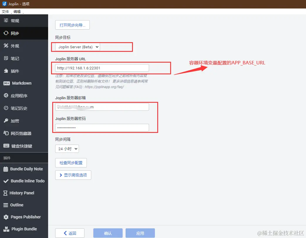 同步目标需要选择Joplin Server,这样才能连上我们自己的私有服务器。