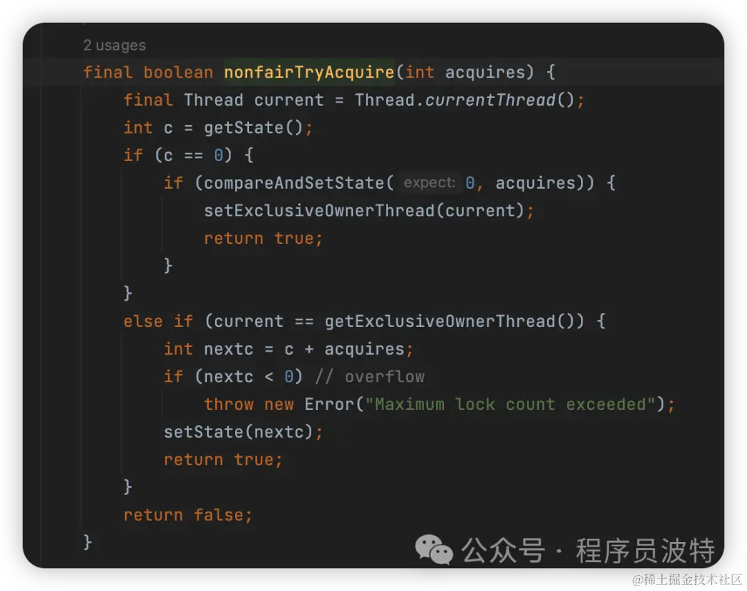ReentrantLock有两个构造方法,默认的构造方法中,sync=new NonfairSync();我们可以从字面意思看出它是一个非公平锁。再看看第二个构造方法,它需要传入一个参数,参数是一个布尔型true 是公平锁,false 是非公平锁。从上面的源码我们可以看出sync 有两个实现类,分别是FairSync 和NonfairSync,我们再看看获取锁的核心方法,首先是公平锁FairSync 的,