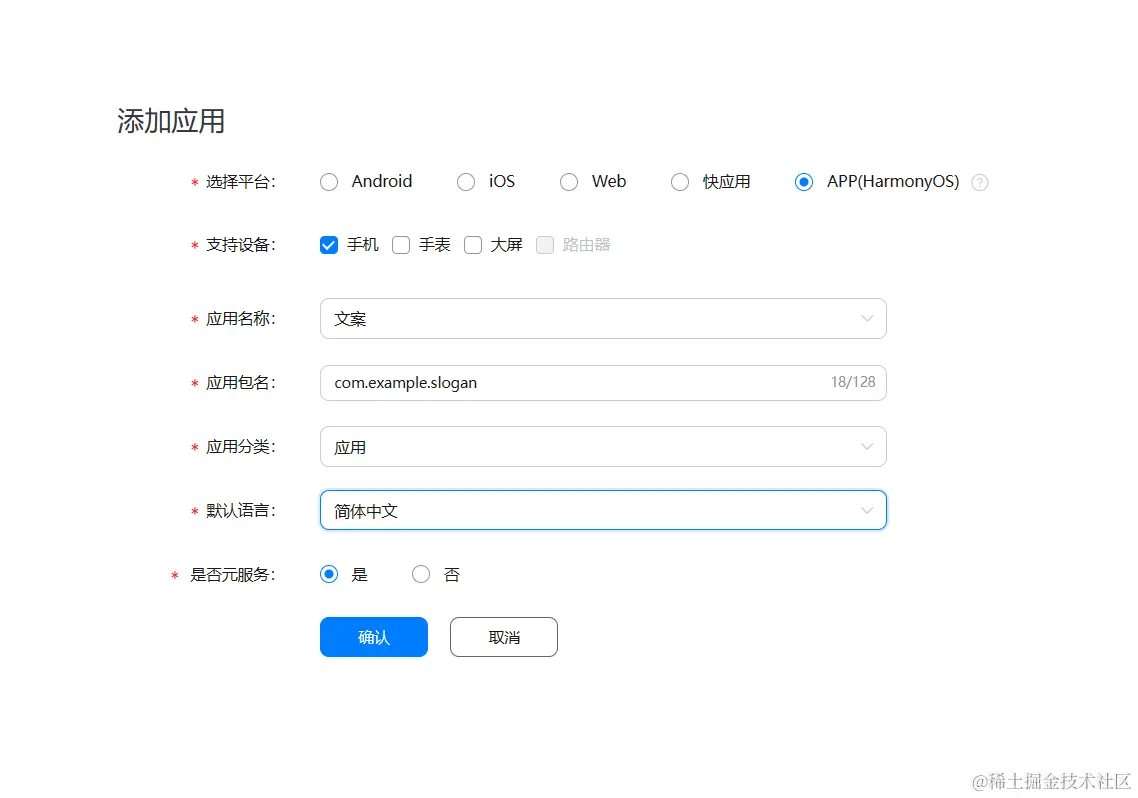 - 是否元服务选择为是,(这关系到以后应用能否以元服务的形式上架分发。)