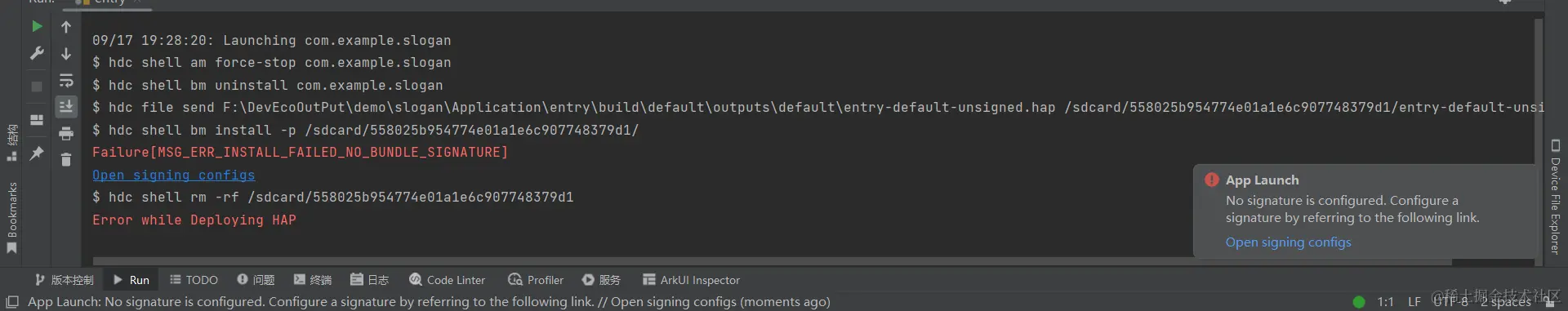 此处报错的原因是我们还没有给程序签名。【目前使用鸿蒙系统开发的程序,都需要先签名才能在真实设备上运行。此处直接使用自动签名】