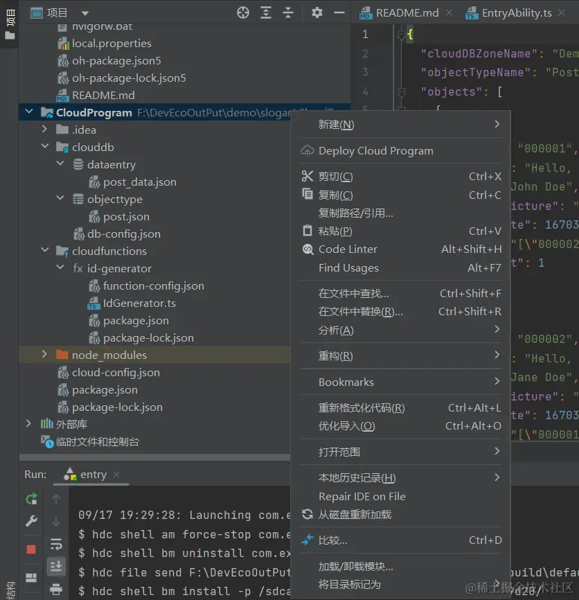 端云模板在这里提供了默认的clouddb和cloudfunctions的代码。我们只要在CloufProgram文件上点击鼠标右键选择“Deploy Cloud Program”部署云数据和云函数的代码。