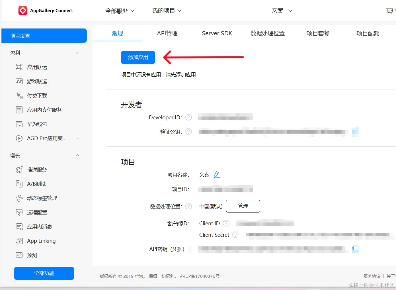 1. 首先进入AGC的管理界面新建一个项目,并添加应用