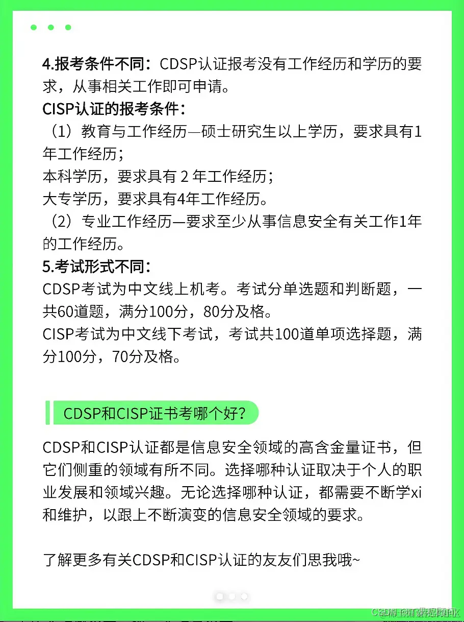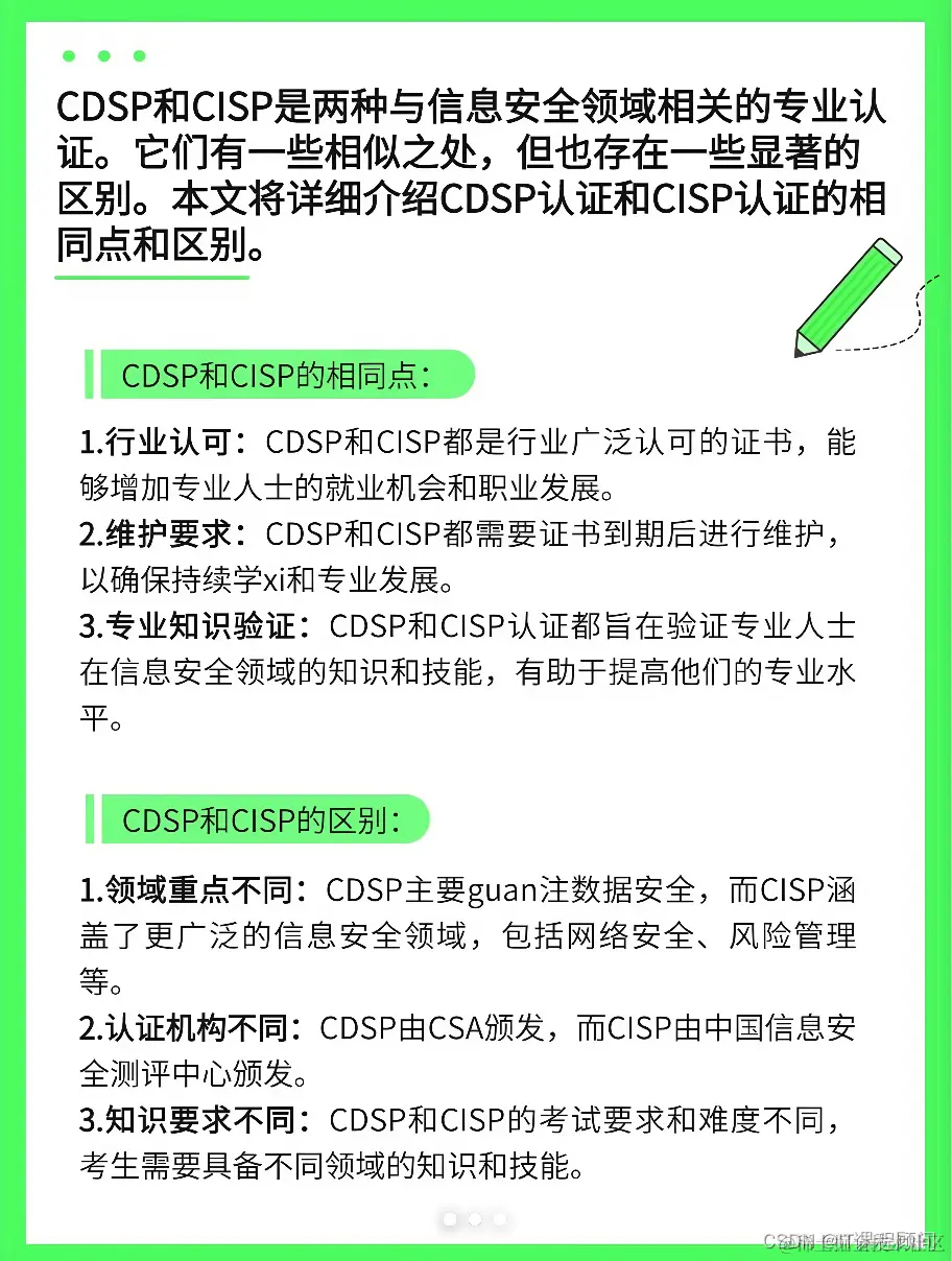 1.领域重点不同:CDSP主要guan注数据安全,而CISP涵盖了更广泛的信息安全领域,包括网络安全、风险管理等。
