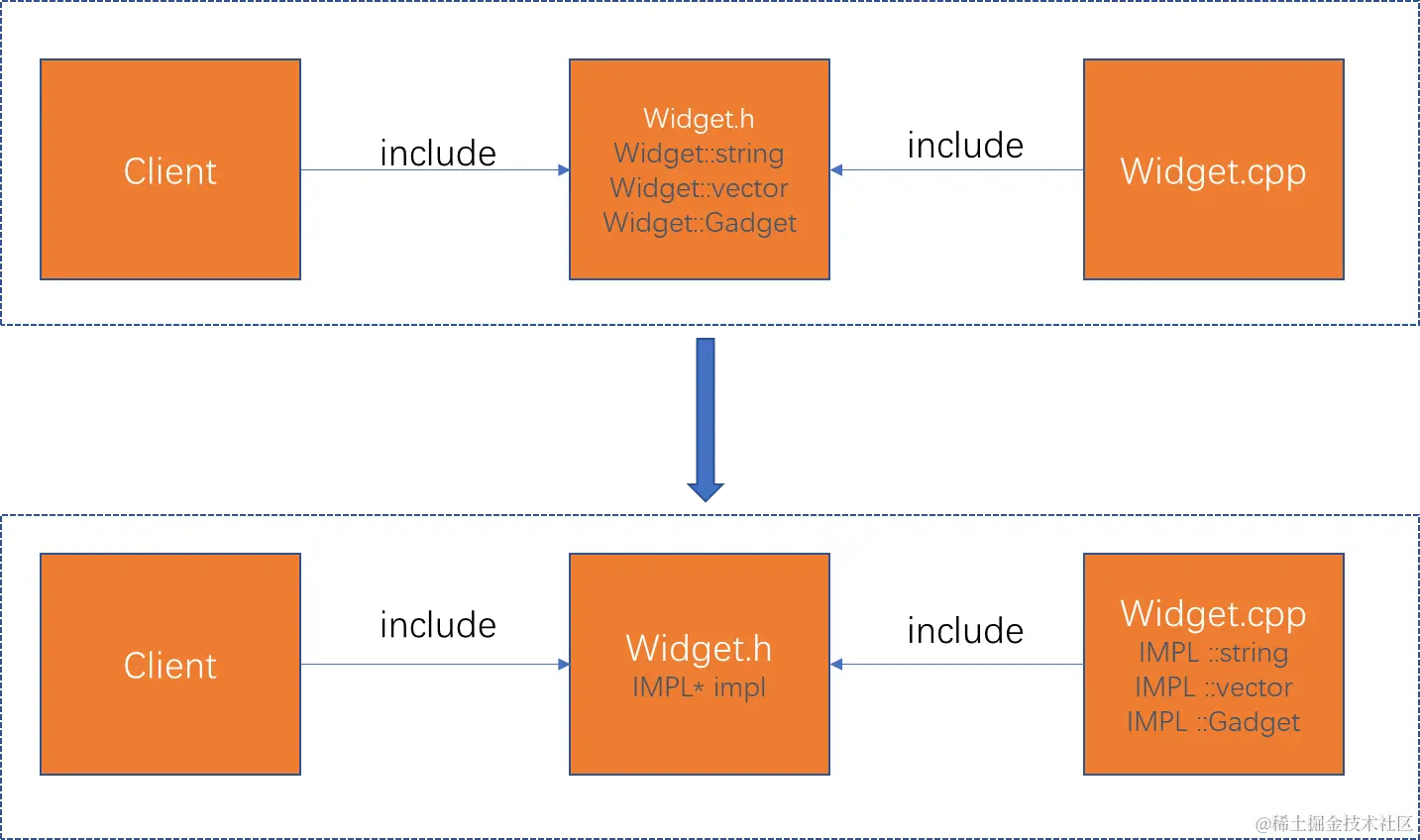 以上这个Widget类,name、data和g1、g2、g3都是Widget类的实现细节。Widget类依赖于std::string、 std::vector和Gadget类的头文件,如果依赖的Gadget等类型定义发生了变化,那么Widget类的头文件也需要重新编译。如果Widget类的头文件被其他类引用,那么其他类的头文件也需要重新编译。这样一来,那么整个项目的编译时间就会变长。