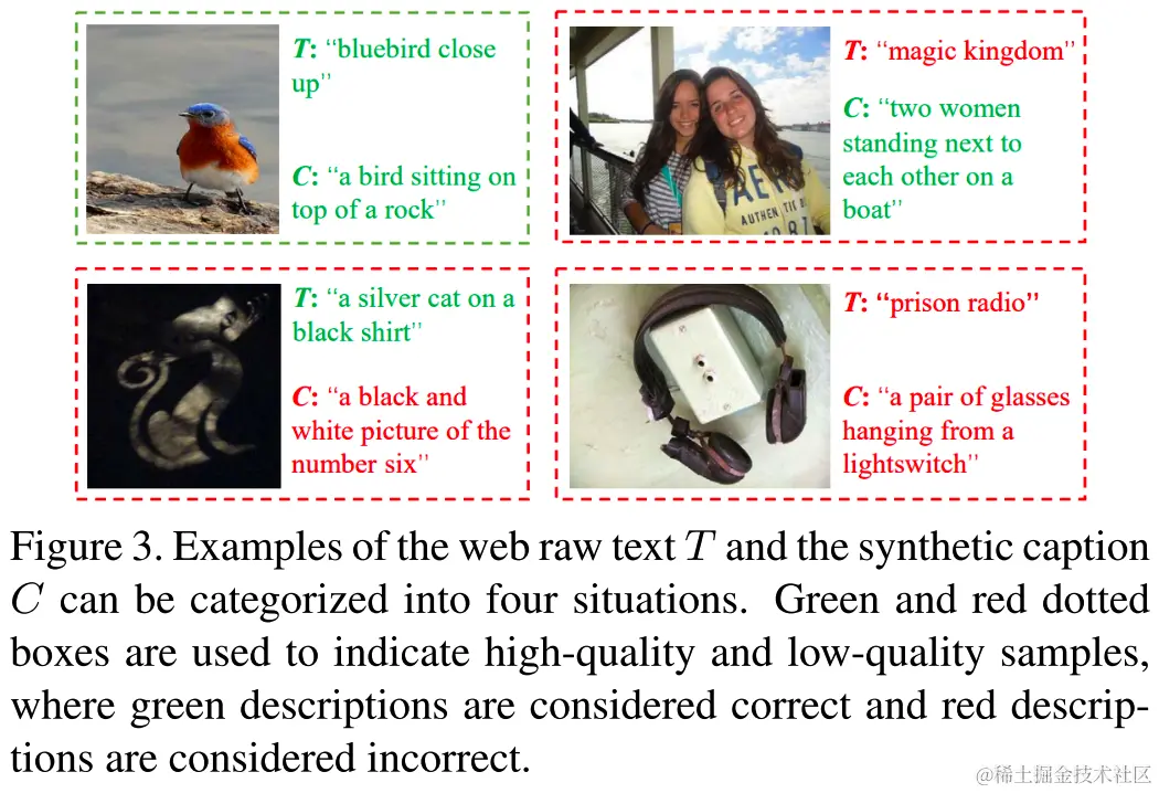 但是Caption又质量高低,不同样本质量不一样(有如下四种),搞一个网络产出权重,用来自适应(Adatptive)对比Loss,把质量差的样本降权,质量好的加权,这样就能自适应强调了;
