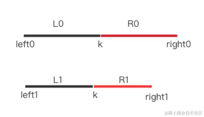 如果要使用二分,核心问题是基于什么规则将数据砍掉一半。而本题是两个序列,所以我们的核心问题是如何从两个序列中分别砍半,图示如下k=(m+n)/2: