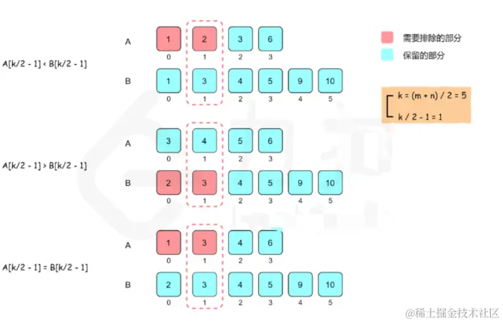 - 如果LA[k/2−1]=LB[k/2−1],则可以归入第一种情况处理。