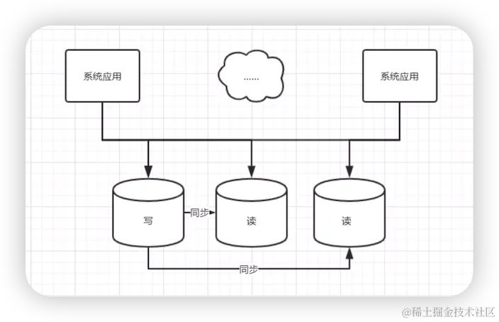 办法总比问题多,随着互联网技术的发展,以及一代代互联网人对互联网的深入研究,人们发现在互联网的系统应用是一个读多写少的应用,比如咱们课程中的电商系统,商品浏览的次数是比下单要多的。数据库承载压力大,主要是由这些读的请求造成的,那么我们是不是可以把读操作和写操作分开,让所有读的请求落到专门负责读的数据库上,所有写的操作落到专门负责写的数据库上,写库的数据同步到读库上,这样保证所有的数据修改都可以在读取时,从读库获得,系统的架构如图所示: