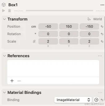 - 创建 2 个立方体,并且在右侧的 Inspector 中将 Material Binding 指定为刚刚新建的材料