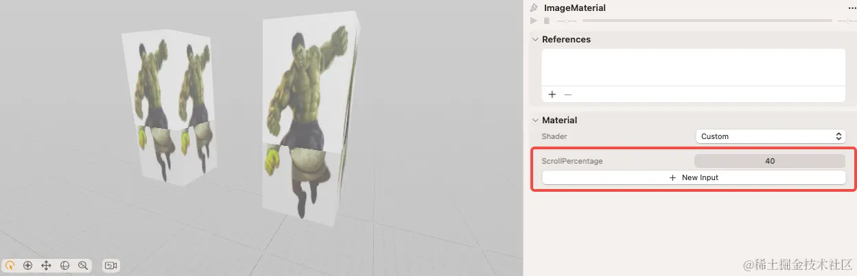 完成上述步骤后,我们只需要在输入的 Float 节点“ScrollPercentage”中选择不同的输入值,就能实现基本的按照分界线渲染贴图的效果了。